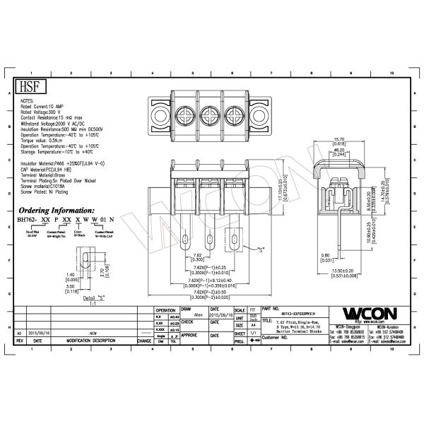 With Fix Hole&W/T CAP D Type 7.62 Barrier Terminal Block1*3P W=13.5 H=14.7 PA66 black.